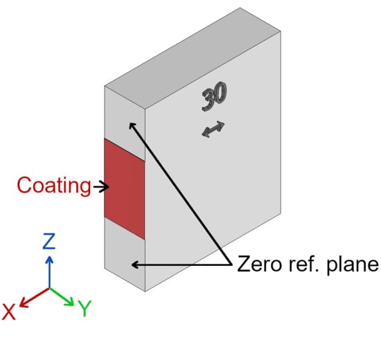 The coating thickness was measured in the software GOM Inspect. The distance between the coated area and the zero reference plane was measured using the Projected Point Distance function. The measurement was conducted for 9 measuring points. The first measuring point was in the center of the coated area. The rest of the measuring points were offset from the center point by ±1.5 mm in the Y direction and by ±5 mm in the Z direction.