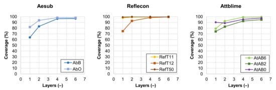 The graphs in Figure 4 show the average coverage of the Si-wafer depending on the number of applied coating layers. The results show that the coverage ability differed between individual sprays. It was the most obvious in the case of the one-layer coating. The highest coverage ability was provided by sprays RefT11 and RefT50, which reached the coverages of 97.9 ± 0.8% and 99.2 ± 0.2% with only the one-layer coating. On the contrary, the lowest average coverage with the one-layer coating was provided by the spray AbB (63.8 ± 2.7%).