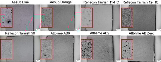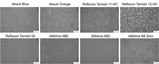 The obtained results showed that all used materials vanished from the surface of the Si-wafer completely. However, it was observed that all coatings left visual traces after their disappearance. The traces on the surface of the Si-wafer were captured by the optical microscope Olympus SZX7 (Olympus), with a magnification of 5.6 (see Figure 12). The bright spots in Figure 12 represent traces left by the vanished coating, and the scales shown in the corners of the images have a value of 500 µm. Traces were present in the areas where the coating clusters were present before their sublimation. A hypothesis for further verification was set, stating that the traces were remains of the components contained in the sprays (e.g., solvents) that left visual marks after the coating disappearance. It is worth saying that these traces were apparent due to the smooth mirror-like surface of the Si-wafer and were easy to remove by wiping with a cloth.