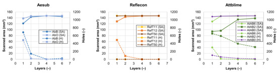 The coating quality was coupled with the results of 3D scanning. Lack of coverage led to incomplete 3D scans with low quality. The results of 3D scanning are summarized in the graphs shown in Figure 6 and Figure 7. Figure 6 shows a dependency of the scanned area (SA) and the number of holes (H) in the captured mesh on the number of applied coating layers. The maximal scanned area was 144 mm2, which was defined by the selected control area 12 × 12 mm.