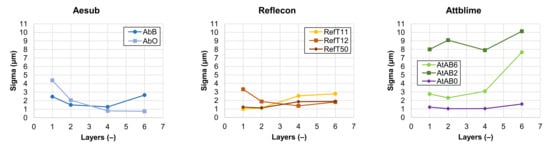 The results of the 3D scan quality analysis are shown in Figure 7. Here, the standard deviation (Sigma) of the scanned point cloud in dependency on the number of applied coating layers is stated. The graphs show the average values.