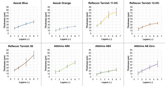 The results of the coating thickness measurement are shown in Figure 8. The graphs show the average values and standard deviations (black lines). Figure 8 shows that all used sprays created coatings with considerable thicknesses detectable by the scanner. This suggests that all tested scanning sprays must be used carefully because thicknesses in the range of tens of micrometers can influence the accuracy of 3D scanning. The coating thickness in the range of tens of micrometers was also typical in the studies of Paloušek and Burde [9,11], where the non-sublimation scanning sprays were investigated. It is worth saying that when the maximum possible scanning accuracy is required, TiO2-based coatings are still the most suitable. According to the work of Franke [10], TiO2-based coatings can be deposited with thicknesses lower than 1 µm.