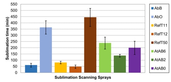 • Tested sprays were divided into three categories according to their sublimation time. Short-time sublimation sprays (AbB, RefT11, and RefT12): sublimation time did not exceed 90 min. Middle-time sublimation sprays (AtAB6, AtAB2, and AtAB0): sublimation times were in the range of 130–300 min. Long-time sublimation sprays (AbO and RefT50): sublimation times were in the range of 300–500 min. The values correspond to the one-layer coatings.