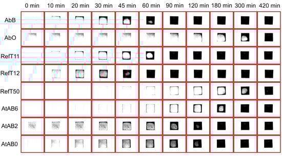 According to the results obtained in this study, tested scanning sprays can be generally divided into three groups according to their sublimation time. The first group of sprays consists of AbB, RefT11, and RefT12 and can be classified as fast-sublimating sprays. In this case, the sublimation time was less than 90 min. Specifically, AbB sublimated after 60 ± 16 min, RefT11 after 81 ± 10 min, and RefT12 after 47 ± 14 min. The second group of sprays consists of AtAB6, AtAB2, and AtAB0 and can be classified as medium-time sublimation sprays. The results show that these sprays provided sublimating times that were approximately in the middle of all used sprays. Sublimation times were 237 ± 48 min for AtAB6, 136 ± 11 min for AtAB2, and 199 ± 54 min for AtAB0. The last group of the sublimation scanning sprays consists of AbO and RefT50. A long sublimation time was typical for these sprays. AbO sublimated approximately 363 ± 54 min, while RefT50 sublimated 444 ± 73 min. Figure 11 shows images of the coatings taken during the sublimation time measurement. The sublimation process of the coating from the Si-wafer for AbB and AbO materials can also be seen in Videos S1 and S2 (from Supplementary Material), respectively. The dark areas represent the surface of the Si-wafer. The sublimation process was the same for all used sprays. The sublimation started on the edges of the Si-wafer and continued to the center of its surface. The only difference was in the sublimation rate. It was also apparent that the sublimation ended in the areas where the largest amount of the coating material was applied. This was generally in the areas where the center of the spray went through the surface of the Si-wafer. However, the trend of the sublimation process also showed that sublimation is influenced by the exposition of the coating edges to the ambient environment.