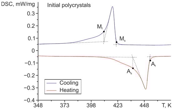 The aging temperature in austenite, 773 K for 3 h, was chosen based on [13,14,15], where it was shown that during this heat treatment the nanoscale dispersed particles of the H-phase are precipitated, strengthening the material and increasing the characteristic temperatures of MT [14,15,16]. Transformation temperatures of aging in austenite in stress-free state, at 773 K for 3 h crystals (initial polycrystals), were obtained using differential scanning calorimeter DSC 404F1 Pegasus (NETZSCH, Selb, Germany) with a cooling/heating rate of 10 K/min.