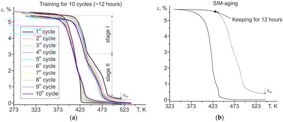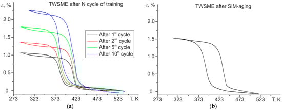 Both regimes (training and SIM-aging) lead to the induction of a high-temperature TWSME at T > 373 K for stress-free cooling/heating cycles (Figure 6).