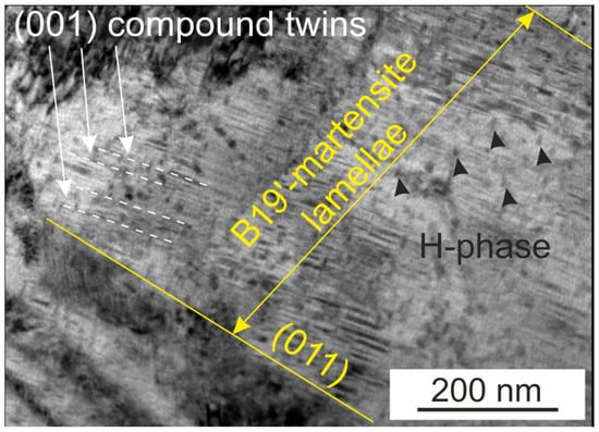 It was shown by electron microscopic studies that Ni50.3Ti32.2Hf17.5 (at.%) polycrystals aged at 773 K for 3 h contain nanoscale dispersed H-phase particles with sizes of 10–15 nm. Figure 1 shows the microstructure of the initial polycrystals aged at 773 K for 3 h before thermomechanical treatments. On the selected area electron diffraction pattern (SAEDP), the reflexes of the B2 matrix and characteristic reflexes 1/2<111>B2, which indicate the presence of H-phase particles, are clearly shown [13,14,15]. The H-phase particles have a face-centered orthorhombic lattice with parameters a = 4a0, b = 2a0, and c = 6a0 [13,14,15]. It was shown that the microstructure is characterized by the presence of wide martensitic lamellae with dimensions of 50–300 nm, which contain internal compound twins (001)B19′ (Figure 1b,c). These martensitic lamellae are twinned by {011} type I, and the dispersed particles of the H-phase are completely embedded in the martensite variants, which is consistent with [17], where internally twinned lamellae of B19′-martensite were also found.