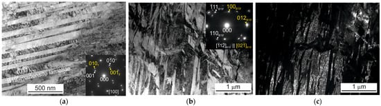 A different morphology of thermal-induced martensite was observed after training (Figure 5), compared with the SIM-aged crystals. Foils for the electron microscopic studies were cut from two parts of the sample—a strongly deformed particle of the sample, in which the localization of residual deformation was observed, and a second part of the sample, where, macroscopically, there were no traces of plastic deformation. It is assumed that in the clean area of the sample after training, type I {011} twins with a lamella width of up to 100 nm were found, inside of which thinner compound twins were presented (Figure 5a). Such a microstructure of martensite differs little from the one, which was observed in the initial crystals. However, a complex microstructure was found in the deformed part of the sample (Figure 5b,c), which is a mixture of several “split” martensitic systems intersecting each other. Such behavior may be a consequence of the high density of dislocations and the presence of residual martensite and internal stresses that induce the formation of various martensite variants, in contrast with SIM-aged crystals (Figure 4 and Figure 5).