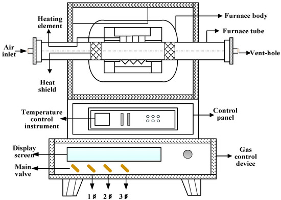 Tubular atmosphere furnace roasting: Arrange the pressed masses in a boat-type corundum crucible and place them in the middle of the furnace. Set the temperature, atmosphere concentration, and time of the atmosphere furnace, and the system begins to enter the preheating stage, slowly heating up, and the temperature range is 0–500 °C. Open the nitrogen valve and the main valve of the gas control device, and set the nitrogen flow rate, so that the furnace is filled with nitrogen and other gases are discharged during the preheating stage. When the temperature reaches the target temperature, the system enters the roasting stage, adjusts the ratio of nitrogen and CO, and passes the mixed gas into the furnace tube. The temperature remains constant until the end of the phase. After the end of roasting, the system temperature began to drop, and CO was stopped and N2 was continued. Ensure that oxygen does not enter the furnace during the cooling process to prevent oxidation of the product. When the temperature drops to the set temperature, turn off the main switch of the temperature control device, and then close all the gas valves when it is at room temperature. The reduction furnace used in the test study is a tubular atmosphere furnace, as shown in Figure 1.