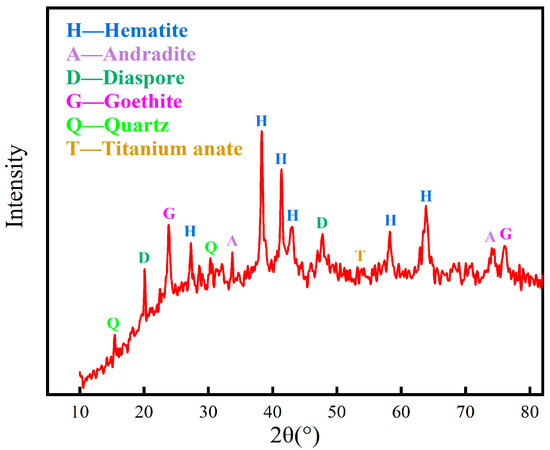 The mineralogical composition was analyzed by the X-ray diffraction method, and the results in Figure 2 show that the minerals in the red mud are complex in composition. The main mineral phases were found to be hematite, andradite, goethite, anatase, and quartz. The different grain grades of red mud were analyzed, and the results are shown in Table 3. The particle size of red mud is fine, and the particle size less than 0.038 mm accounts for about 50%; the iron grade of this part of red mud is only 38.98%, while the iron grade of particles larger than 0.038 mm is more than 42%.