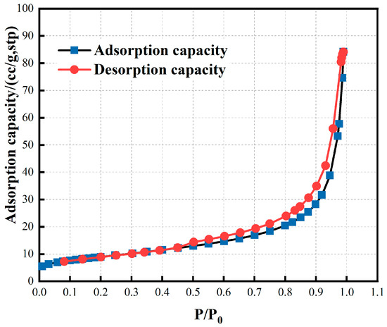 The specific surface area of red mud is large, which is 100–200 times that of ordinary iron ore powder of the same particle size (1000–2000 cm2/g) (Table 4). The BET surface area of red mud is 32.18 m2/g. As shown in Figure 3, the nitrogen adsorption–desorption isotherms curves of the red mud belong to type III adsorption isotherm according to the Brunauer–Emmett–Teller (BET) classification. The slow increase of nitrogen uptake at low relative pressure (P/P0 < 0.5) implies transition from a single-molecular layer to a multimolecular layer, whereas the sharp increase and the hysteresis loop at high relative pressure (P/P0 = 0.5–1.0) indicate the presence of mesoporous and macroporous materials in the red mud. There was no adsorption saturation when the vapor pressure reached saturation. At this time, large-pore volume filling occurs due to capillary condensation, which makes the adsorption capacity increase rapidly.