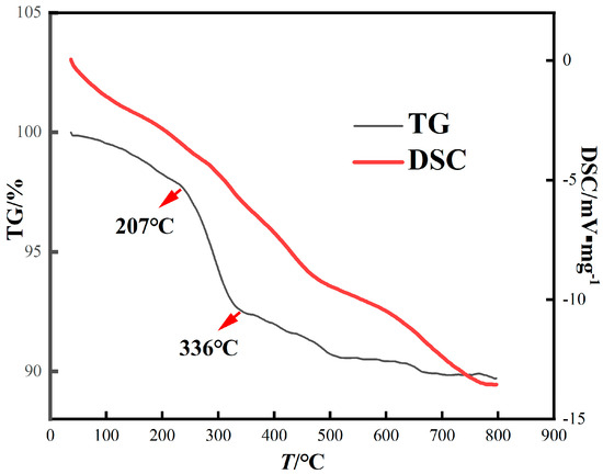 In order to explore the physical and chemical changes of red mud during roasting, thermogravimetric (TG) analysis of red mud was performed at 0~800 °C (Figure 4). The steep fall in curves from 0 °C to 800 °C indicates a strong interaction of CO with red mud, and the total mass loss was 10.29%. These curves are slightly different, which are due to the different chemical composition of the red mud. They mainly show similar curves, and the curves can be divided into three stages. In the first stage (36~207 °C), the weight loss of red mud is 1.85%, mainly due to the decomposition of part of the crystal water. In the second stage (207~336 °C), the weight loss is about 5.21%, and the weight loss rate is faster. At this point, the boehmite and goethite decompose into hematite [31]. In the third stage (336~559 °C), the red mud continued to lose weight by 2.35%, which may be related to the decomposition of calcite [32]. According to the DSC curve, the red mud is in an endothermic state; thus, a reducing agent must be added for the reaction to occur.
