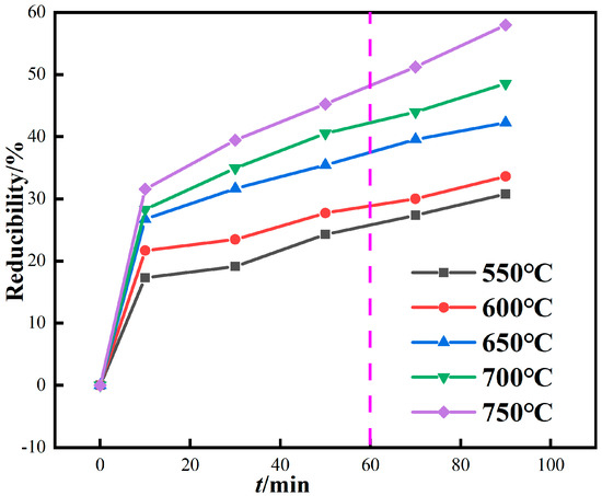 When the CO concentration is 20% and the roasting temperature is 600 °C, 650 °C, 700 °C, 750 °C, and 800 °C, the influence of roasting time on the reduction degree of iron in red mud is studied, and the results are shown in Figure 7. In magnetization roasting, the theoretical reduction degree of hematite or goethite is 42.8%. As shown in Figure 7, when the roasting temperature is above 650 °C and the reduction time exceeds 60 min, the reduction degree exceeds the theoretical value of magnetization roasting, and there is an obvious overreduction phenomenon.