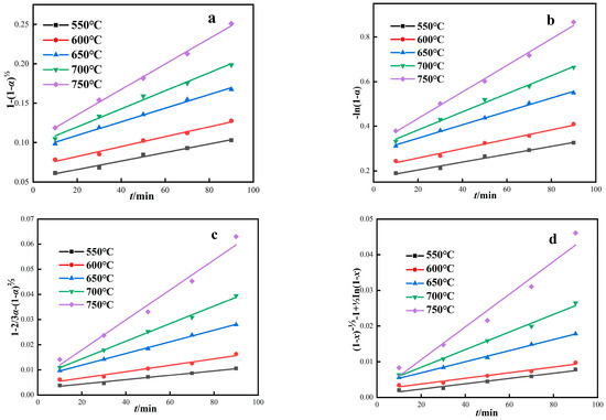 According to four dynamic control models, the roasting test results were linearly fitted under different thermodynamic temperatures. As shown in Figure 8 and Table 5, reaction rate constants (k1, k2, k3, k4) and correlation coefficients (R2) of the four kinetic models were obtained from linear equation parameters. The correlation coefficient reflects the matching degree of different control models to the magnetization roasting process. The red mud magnetization reduction roasting process fits the four control models well, and the correlation coefficients of the four models are all above 0.95. From the fitting results, it is impossible to determine which control model is more consistent with the magnetization reduction roasting process of red mud, and further study is needed.