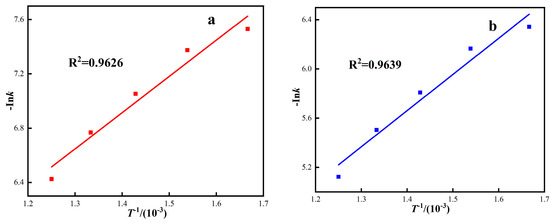 where x represents reduction fraction, α represents the degree of reduction: α = (FeO/TFe) × 100%, k represents the reaction rate constant. The activation energy of the interface reaction control model ranges from 40 to 300 kJ/mol. Equation (17) is deformed to obtain Equation (18).