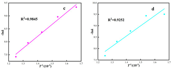 At different thermodynamic temperatures, 1/T was plotted by Ink according to four dynamic control models, and the corresponding fitting curve was obtained, as shown in Figure 9. The apparent activation energy of the reaction was calculated by fitting the curve equation parameters, and the calculation results are shown in Table 6. As can be seen from Figure 9 and Table 6, the four dynamic control models are well fitted, and the correlation coefficients R2 are all above 0.90. The activation energies of the interfacial chemical reaction control model, carbon gasification reaction control model, internal diffusion control model, and hybrid control dynamics model are 22.18 kJ·mol−1, 24.47 kJ·mol−1, 38.31kJ·mol−1, and 37.25 kJ·mol−1, respectively.