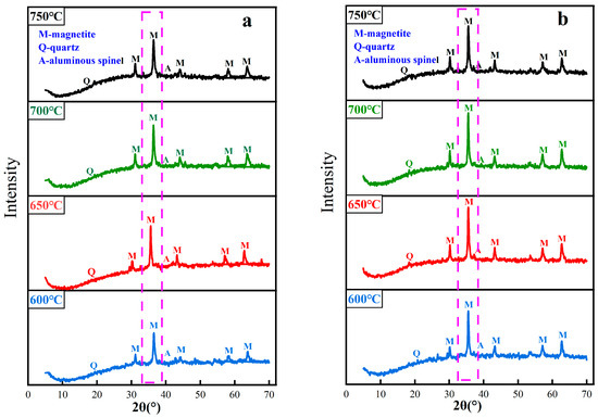 When the roasting temperature is in the range of 600~750 °C, the phase analysis of coal-based and gas-based roasted ores is carried out, and the results are shown in Figure 10. After magnetization roasting, hematite and goethite in the red mud are transformed into magnetite, and some quartz and a small amount of aluminum spinel exist. Figure 10a shows that during coal-based magnetization roasting, the diffraction peak intensity of magnetite increases with the increase in temperature. When the roasting temperature is 700 °C, the intensity of the diffraction peak is the highest, and the intensity of the diffraction peak begins to decline as the temperature continues to rise. As shown in Figure 10b, during gas-based magnetization roasting, the diffraction peak intensity of magnetite is the highest when the roasting temperature is 650 °C. When the temperature continues to rise to 700 °C, the change in diffraction peak intensity is not obvious, and when the temperature rises to 750 °C, there is a downward trend. By comparing the phase transformation rules of the two kinds of roasted ore, it is found that the temperature of gas-based magnetization roasting is lower than that of coal-based, and the diffraction peak intensity of magnetite is obviously higher than that of coal-based.