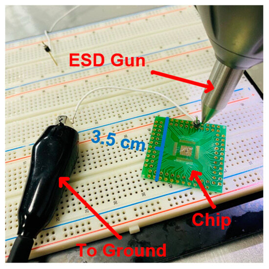 ESD events can occur in various settings, such as manufacturing facilities, hospitals, offices, and homes. In manufacturing facilities, ESD events can occur when people handle electronic components or assemble electronic devices. At hospitals, offices, and homes, ESD events can occur when people use medical devices or walk on floors that generate static electricity. Furthermore, ESD failure is the main electronic reliability problem under the system-level and component-level ESD tests. Figure 1 shows that the chip suffered as a result of the firing of an ESD gun under the system-level ESD test. Advanced process technologies will cause the gate oxide layer of the transistor to become thinner and quickly break down under ESD events. In order to avoid ESD events, each input and output terminal in the circuit should be protected by ESD protection circuits [4,5].