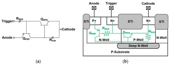 To avoid irreversible damage to the chip, which is inflicted via the ESD current from the input terminal, the ESD protection components are needed to protect the internal circuit from ESD current. The SCR device is shown in Figure 2 [8,9]. The SCR device is made of a four-layered P/N/P/N structure, which is equivalent to the cross-coupling structure of the p-n-p BJT and the n-p-n BJT. This cross-coupled structure allows the SCR device to form a positive feedback mechanism. After the ESD is stressed from the anode, the N-Well/P-Well forms the reverse-biased PN junction. When the voltage is reverse biased to the avalanche breakdown point, the SCR device is triggered to discharge the ESD current. It takes time for the SCR device to be triggered, which may cause the internal circuit to be destroyed by ESD. Providing an additional trigger voltage can make the SCR device turn on faster, allowing the SCR device to protect the internal circuit more effectively.