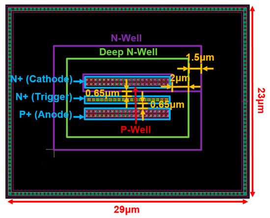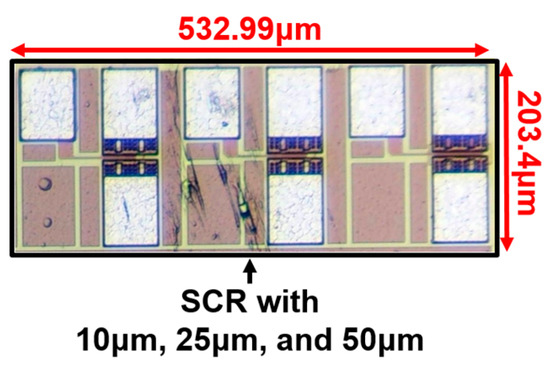 The design parameters of the SCR device are displayed in Table 1. The SCR device is used in the sizes of 10 μm, 25 μm, and 50 μm, namely SCR_10μm, SCR_25μm, and SCR_50μm. Additionally, Figure 3 shows the layout top view of the SCR_10μm.