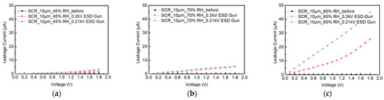 During testing SCR_10μm, the ambient relative humidity is humidified from 45%RH to 70%RH and 95%RH. Figure 8a–c shows the system-level ESD robustness of the SCR_10μm. They also show that the leakage current of the SCR_10μm in the air discharge mode exceeds 30% of its original leakage current under different relative humidities. Therefore, the system-level ESD robustness of the SCR_10μm in air discharge mode is less than 0.2 kV, indicating the minimum discharge voltage value of the ESD gun.