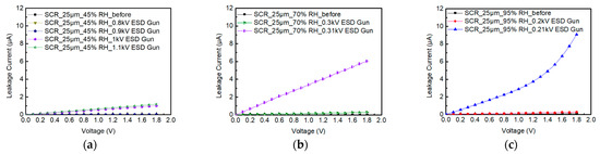 The I–V curves of SCR_25μm before and after system-level ESD zapping at (a) 45%RH, (b) 70%RH, and (c) 95%RH.