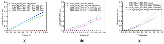 The I–V curves of SCR_50μm before and after system-level ESD zapping at (a) 45%RH, (b) 70%RH, and (c) 95%RH.