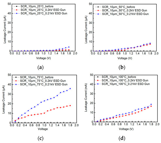 The ambient temperature is heated from 25 °C to 50 °C, 75 °C and 100 °C during the testing of SCR_10μm. Figure 11a–d shows the system-level ESD robustness of the SCR_10μm. They also show that the leakage current of the SCR_10μm with a 0.2 kV ESD gun in contact discharge mode exceeds 30% of its original leakage current under a different temperature. Therefore, the system-level ESD robustness of the SCR_10μm in contact discharge mode is less than 0.2 kV, indicating the minimum discharge voltage value of the ESD gun. According to the increase in the leakage current, it can be judged that the system-level ESD robustness of the SCR_10μm will decrease with an increase in the ambient temperature.