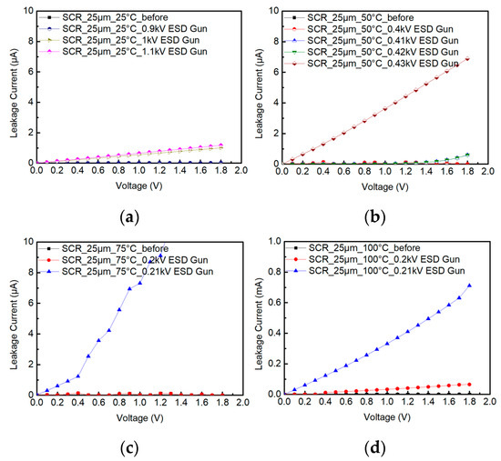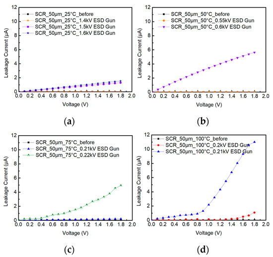 During the testing of SCR_50μm, the ambient temperature is heated from 25 °C to 50 °C, 75 °C, and 100 °C. Figure 13 shows the system-level ESD robustness of the SCR_50μm, in which the ESD robustness decreases as the temperature increases, and, subsequently, the ESD voltage steps are set to smaller values. Figure 13a–d also shows that the leakage current of the SCR_50μm exceeds 30% of its original leakage current with the 1.5 kV, 0.6 kV, 0.22 kV, and 0.2 kV ESD guns in contact discharge mode. The system-level ESD robustness of the SCR_50μm in contact discharge mode is 1.4 kV at 25 °C, 0.55 kV at 50 °C, 0.21 kV at 75 °C, and less than 0.2 kV at 100 °C. According to the results, it can be seen that the ambient temperature continues to rise, and that the SCR_50μm is more likely to be damaged by the ESD.