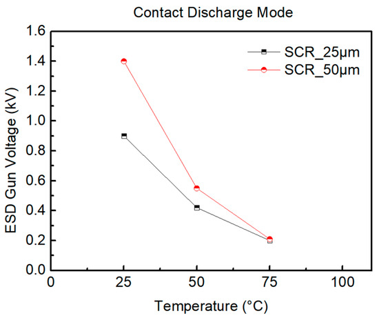 During the testing of SCR_25μm, the ambient temperature is heated from 25 °C to 50 °C, 75 °C, and 100 °C. Figure 12 shows the system-level ESD robustness of the SCR_25μm. Figure 12a–d also shows that the leakage current of the SCR_25μm exceeds 30% of its original leakage current with the 1 kV, 0.41 kV, 0.21 kV, and 0.2 kV ESD guns in contact discharge mode. The system-level ESD robustness of the SCR_25μm in contact discharge mode is 0.9 kV at 25 °C, 0.4 kV at 50 °C, 0.2 kV at 75 °C, and less than 0.2 kV at 100 °C. According to the increase in the leakage current, it can be seen that the system-level ESD robustness of the SCR_25μm will gradually decrease with an increase in ambient temperature.