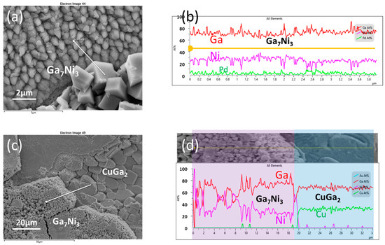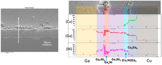 - Lee, D.; Kim, C.-L.; Sohn, Y. Formation and Growth of Intermetallic Compounds during Reactions between Liquid Gallium and Solid Nickel. Materials 2021, 14, 5694. [Google Scholar] [CrossRef]