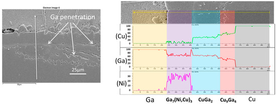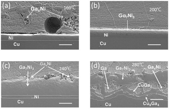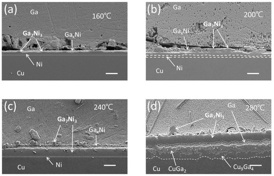 - When the reaction temperature is low, the presence of Ga-rich GaxNi (x = 89–95 at%) IMCs on top of the Ga7Ni3 layer was distinctly verified. As the reaction temperature and duration increase, the Ni layer becomes progressively consumed. This results in the formation of Ga-Cu IMCs, specifically CuGa2 and γ3-Cu9Ga4, beneath the Ga-Ni IMC layer. Simultaneously, the gap between the Ga-Ni and Ga-Cu IMC layers widens, creating space for molten Ga to infiltrate.
