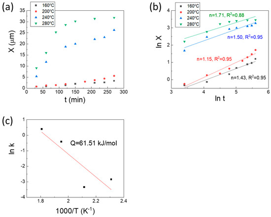 - The time exponent for Ga7Ni3 growth was determined to range approximately from 1.1 to 1.7. These outcomes underscore the substantial reliance of Ga7Ni3 IMC growth on interface reaction-controlled kinetics, at low reaction temperatures spanning from 160 to 240 °C.