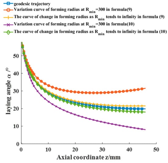 To verify the universality of placement path planning, this study selects an unequal pole hole pressure vessel as the object of study. The meridian curve equation is , where b and R are the semi-minor and semi-major axes, respectively, of the ellipse with values of 50 mm and 53 mm, as shown in Figure 2. The left and right head heights are h1 = 46 mm and h2 = 42 mm, respectively; the cylindrical length is L = 200 mm; the prepreg width is W = 6.35 mm; and = 300 mm. The initial laying angle of the left dome is set to 60°. By applying Equations (9) and (10), the end laying angle variation of prepreg without wrinkle defects of the left ellipsoidal dome near the cylinder section is calculated to be [8.03°, 18.04°] ∪ [21.54°, 31.55°], and the laying angle variation along the axial direction of the ellipsoidal dome is shown in Figure 3. Combined with Equation (6), the Runge–Kutta formula is used to calculate the mandrel rotation angle θ of the placement path under the corresponding laying angle, and the three-dimensional placement path of the ellipsoidal dome is shown in Figure 4. As the minimum forming radius tends toward infinity (with a value of mm selected as infinite in this paper), the placement path of the dome section will approximate the geodesic curve with an initial angle of 60° but will not coincide with it, as shown in Figure 3 and Figure 4. The analysis of Equations (9) and (10) indicates that the influence of the Gaussian curvature of the dome surface and the geodesic curvature of the placement path makes it impossible to place the prepreg on certain geodesic lines on the surface without wrinkle defects, regardless of the value of , which also explains why, as described in the literature [], prepregs with a certain width may sometimes produce wrinkle defects even when placed on the geodesic path of a curved surface. The wrinkle-free laying angle range at an ellipsoidal dome section is enlarged by reducing the value of a preform plane placement, the selection of deployment placement path parameters at the ellipsoidal dome section is expanded, and the optimal deployment placement path parameters are subsequently optimized to use an optimization algorithm and a finite element analysis.