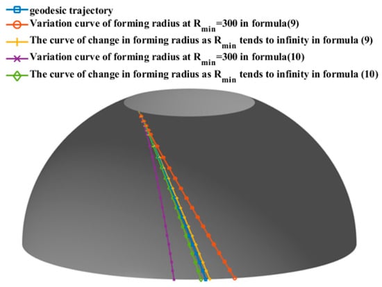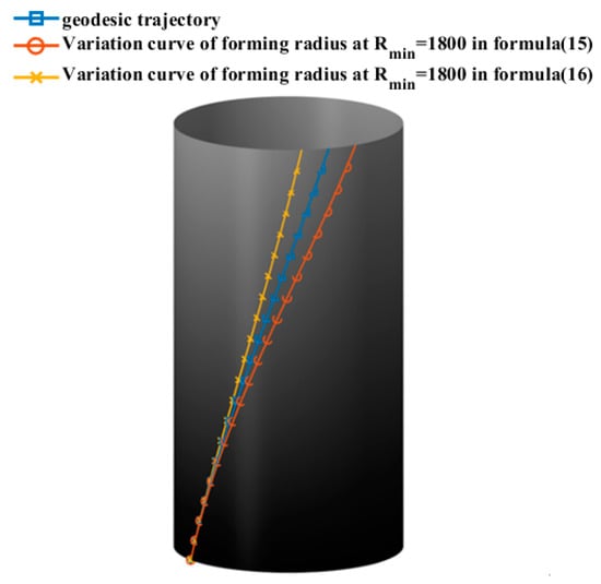 As the minimum forming radius of the prepreg approaches infinity, the wrinkle-free placement path of the cylinder section converges to the geodesic curve. This implies that a prepreg with a certain width can be placed on the surface of a rotating body with a constant cross-section without any wrinkle defects, following the geodesic trajectory.