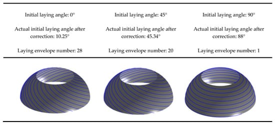 The process of analyzing the full coverage of the placement path is illustrated in Figure 11. The mandrel and prepreg described above are analyzed for placement path coverage. The prepreg minimum forming radius is set to = 300 mm. The initial laying angles of the left and right ellipsoidal domes are 60° and 30°, and the final laying angles of the left and right ellipsoidal domes are calculated to be within the range of [8.03°, 18.039°] ∪ [21.54°, 31.55°] and [5.71°, 14.19°] ∪ [17.27°, 26.03°], respectively. The final laying angles of the left and right ellipsoidal domes are set as 25° and 10°, respectively, to obtain a constant laying angle range of [0°, 39.15°] for the cylinder section. A constant laying angle of 30° is selected for the cylinder section. The value of M is chosen as 2, and the value of k is chosen as 37, resulting in a tiny angle of ∆θ = 97.39°. Based on the above data, the effect of prepreg forming for different laying paths is shown in Figure 12. The minimum laying angle for the cylinder section is 10°, and the minimum coverage fraction of prepreg on the cylinder section is as follows: