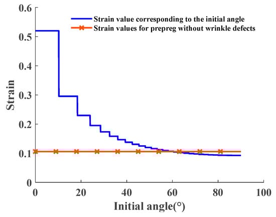 The third step involves conducting a wrinkle detection analysis of the placement path. By combining the wrinkle-free criterion, the placement path obtained in the second step is evaluated for the presence of wrinkle defects. Taking the right ellipsoidal dome of the mandrel as an example, the minimum forming radius is set to 30 mm for the prepreg plane lay-up without wrinkle defects. With the initial laying angle analysis range set to [0°, 90°], the maximum prepreg strain corresponding to different initial lay-up angle paths of the right ellipsoidal dome is calculated by using Equations (2)–(4) and compared with the selected prepreg limit strain without wrinkle defects. As depicted in Figure 7, since corrections must be made according to the number of placement paths after a given initial laying angle, a specific range of initial lay-up angles corresponds to the same actual initial laying angle and placement path. Hence, step-like fold strain values will appear in Figure 8. Based on the calculation results, the range of initial angle selection for the right ellipsoidal dome without defects is determined to be [60.56°, 90°]. As the initial angle of the laying curve increases gradually, the variation in strain values during the placement of prepreg exhibits a progressively gentle trend. Furthermore, the placement path pattern of the ellipsoidal dome depicted in Figure 7 can also be employed for reinforcement structures of the pressure vessels. The construction of ellipsoidal dome structures using a multi-layered deposition approach enables precise reinforcement of vulnerable regions within the pressure vessels. This precise reinforcement leads to an effective enhancement in the strength utilization efficiency of the fiber material, concurrently reducing the superfluous mass of the vessels. This reinforcement strategy not only contributes to the optimization of structural performance in pressure vessels but also unveils broader prospects for practical engineering applications.