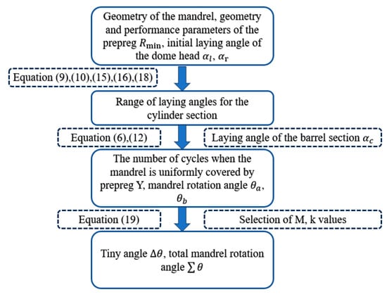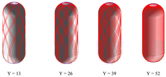 where and represent the ellipsoidal dome and cylinder section placement path corresponding to the mandrel rotation angle, respectively; is a tiny angle; and M is the number of revolutions of the mandrel when the prepreg is covered. Y is similar to N in Equation (12) and represents the number of cycles required for the mandrel to be uniformly covered by prepreg. The laying angle α involved in the calculation of the actual laying coverage width is the minimum laying angle of the cylinder section. K is an integer number that satisfies the requirement that k/Y is the simplest true fraction.