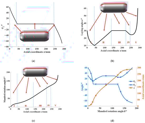 Variation curve of the placement process parameters: (a) variation curve of ; (b) variation curve of the laying angle ; (c) variation curve of mandrel rotation angle ; (d) variation curves for each process parameter based on the mandrel rotation angle .