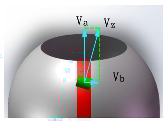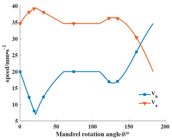 The laying speed plays a crucial role in the forming quality and efficiency of composite components and is influenced by other process parameters. Thus, studying the stable regulation of prepreg laying speed via the robot and mandrel rotation axis is of great significance in producing high-quality and efficient composite components. As depicted in Figure 15, the prepreg laying speed comprises the axial shift speed of the laying head () and the mandrel rotation speed (). The values of and can be calculated based on the laying angle at different moments.