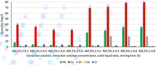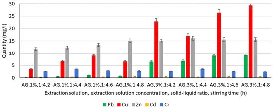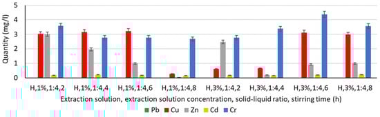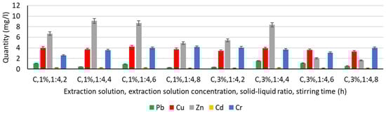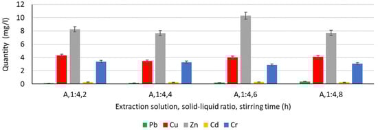 - In the case of Cd, an improvement in the process is appreciated with increasing concentration of malic acid solution, but the recorded values (mg L−1) remain subunit. It should be noted, however, that in the case of the use of 3% malic acid solution, the values recorded exceed 0.5 mg L−1, falling within the range 0.67–0.78 mg L−1, values which were not recorded in the previous cases of the use of other extraction solutions, the maximum value being 0.32 mg L−1 in the case of extraction in water with a stirring time of 6 h. Even for the case of using 1% malic acid solution, slightly improved values are recorded, i.e., 0.49 mg L−1 for 2 h stirring time. A similarity with the previous situations can be appreciated in the tendency for reduction of Cd extraction with increasing stirring time in a 1% malic acid solution, as opposed to the positive influence of increasing Cd quantity with increasing stirring time in a 3% solution.