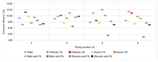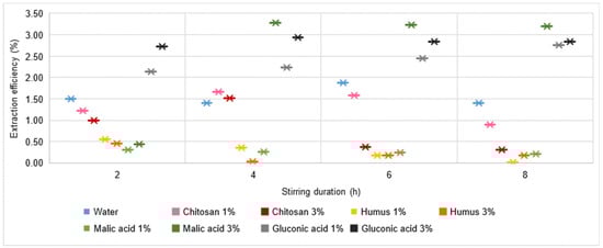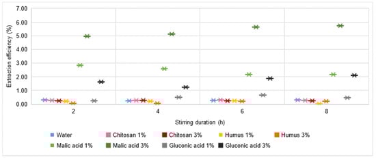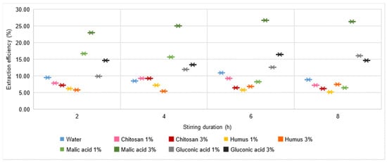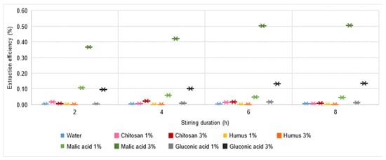 - Cr extraction in malic acid solutions is not significantly different from the cases using water, chitosan, or humus solutions, with values in the range of 1.11–3.97 mg L−1. For this element, a negative effect of increasing the concentration of the malic acid solution and increasing the stirring time can be appreciated;