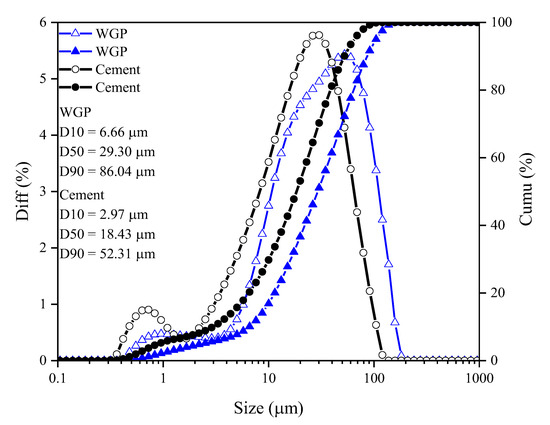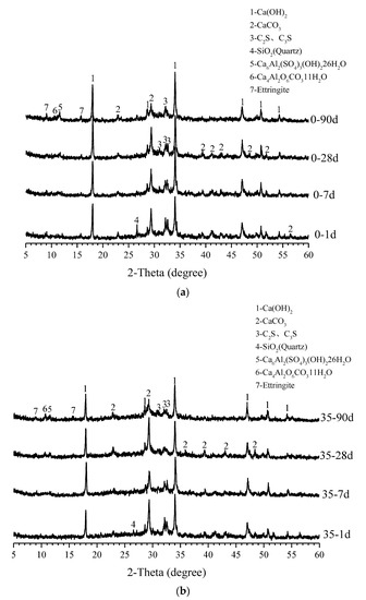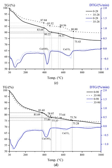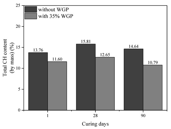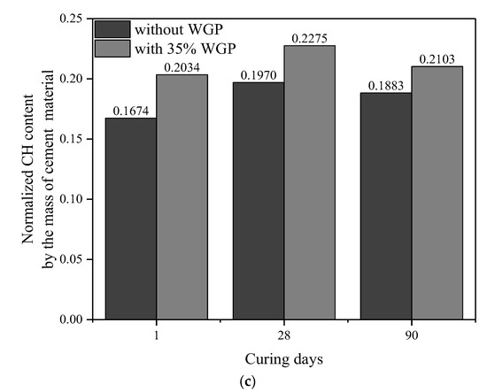 - The pozzolanic reaction of WGP consumes CH in cementitious systems, as confirmed by XRD patterns and CH content analysis from TG-DTG curves. Compared with the samples without WGP, the normalized CH content per unit binder mass containing 35% WGP decreased by 21.01%, 24.94%, and 27.41% at the ages of 1, 28, and 90 days, respectively.