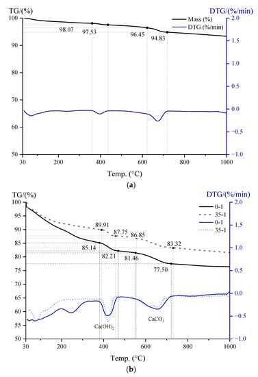 Firstly, for cement, the weight loss around 400 °C caused by CH dehydration is . According to the chemical equation shown in Equation (5), the amount of CH is , indicating a CH content of 2.22% in raw cement.