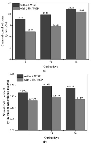 Thirdly, chemical-bonded water can be calculated right after decomposition of CH [51] as for 35 wt.% WGP-modified paste curing for one day, which can reflect the hydration degree of cement indirectly. Thus, normalized CH content per unit binder mass is calculated as , which means 1 g of binder produces 0.13 g of CH after one day of hydration. Furthermore, normalized CH content per unit cement mass can be worked out as . Figure 11 displays the amounts of chemical-bonded water and normalized CH content. The amounts of chemical-bonded water in WGP-modified paste are lower than plain paste for all ages, whereas the growth rate is distinctly higher at 90 days. Compared with the samples without WGP, the CH content in the cementitious material containing 35% WGP decreased by 21.01%, 24.94%, and 27.41% at the curing ages of 1, 28, and 90 days, respectively. In addition, the normalized CH content per unit cement mass in Figure 11c confirms that WGP used can improve the hydration degree by 21.53%, 15.48%, and 11.68% at ages 1, 28, and 90 days, respectively, contributing to the late-age strength development of pastes.