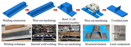 - The 2000 mm long orthotropic bridge deck was divided into six U-rib fatigue test specimens of 300 mm width by wire cutting equipment; then, the U-rib fatigue test specimens with 100 mm width were obtained by continuous cutting. Finally, the T-joint specimens used in this study were obtained by local wire cutting.