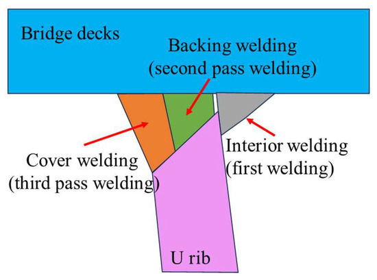 - According to the size and welding process of the orthotropic steel bridge decks used in the Hong Kong-Zhuhai-Macao Bridge, the U-rib specimens of the bridge decks were fully automatically welded by the Wuhan Second Navigation Engineering Bureau. The welding sequence involved simultaneous welding of the interior welding seam, then stepwise welding of the exterior welding seam (see Figure 2). The welding parameters were current 300–320 A; voltage 30 V; the welding speed for the first pass (backing welding) was 300 mm/min, and the welding speed for the second pass (cover welding) was 350 mm/min. At the same time, during the welding process, the two ends of the U-rib top plate of the bridge panel were clamped to restrict their movement.