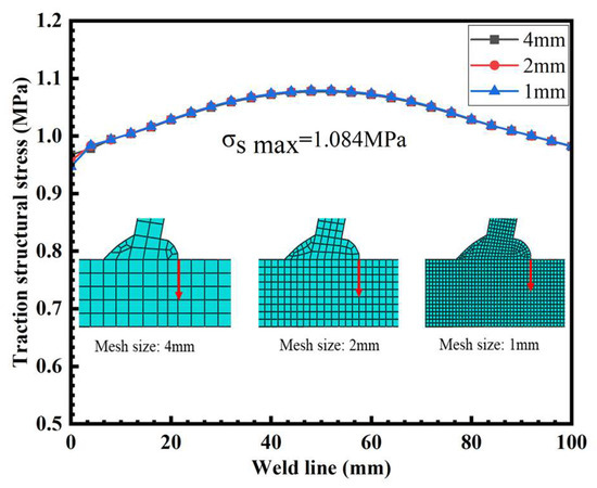 In order to verify the mesh insensitivity of the structural stress method, three FE models with mesh sizes of 4 mm, 2 mm, and 1 mm were used to calculate the structural stress of T-joints.
