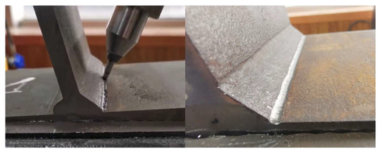 In this study, the UIT-300 ultrasonic impact gun was used to treat the weld toe of the T-joints. The diameter of the impact needle was 4 mm, the working frequency of the ultrasonic impact gun was 17.7 kHz, and the amplitude was 25 μm. First, the specimen was fixed on the workbench. Then, the impact needle was aligned with the weld toe, making sure that the impact zone at the weld seam was consistent with the base metal. The axis of the impact gun was located on the centerline of the transition angle between the weld toe and the base metal. The impact needle repeatedly impacted along the longitudinal direction of the weld toe until a clear trace was formed, as shown in Figure 8.