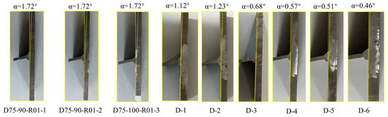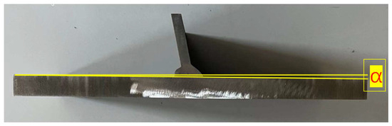During the welding process, the uneven heat input caused shrinkage in the thickness direction of the T-joints, thereby leading to angular misalignment α of the joints, as shown in Figure 10. In fatigue tests, additional tensile stress and bending stress are generated on the weld toe and root of the T-joints, reducing the fatigue life of the welded joints. Therefore, when evaluating the fatigue performance of welded joints, it is necessary to consider the influence of angular misalignment α. For the measurement of the angular misalignment α of T-joints, the contour profiles of test specimens are firstly scanned in 3D; then, the contour shapes are imported into computer-aided design (CAD) and the angular misalignment α of the specimens is obtained using its built-in measuring tools. Figure 11 shows the measurement results of angular misalignment α of the specimens in this study. Compared with the original welded T-joints, the angular misalignment α of the test specimens after UIT was significantly reduced by approximately 50%. Meanwhile, there were obvious arc-shaped notches at the exterior weld toe, and the transition angle between the weld and the base material was significantly improved.